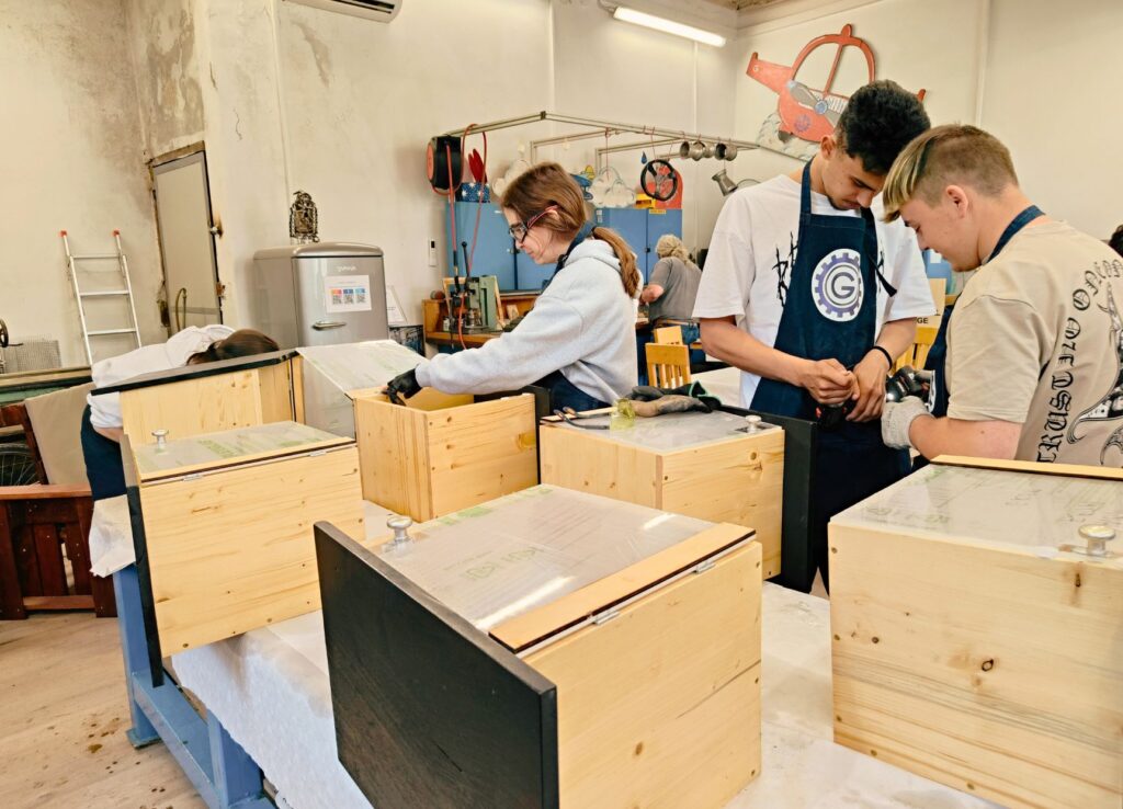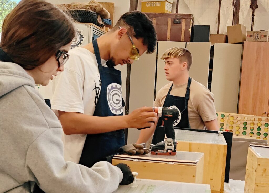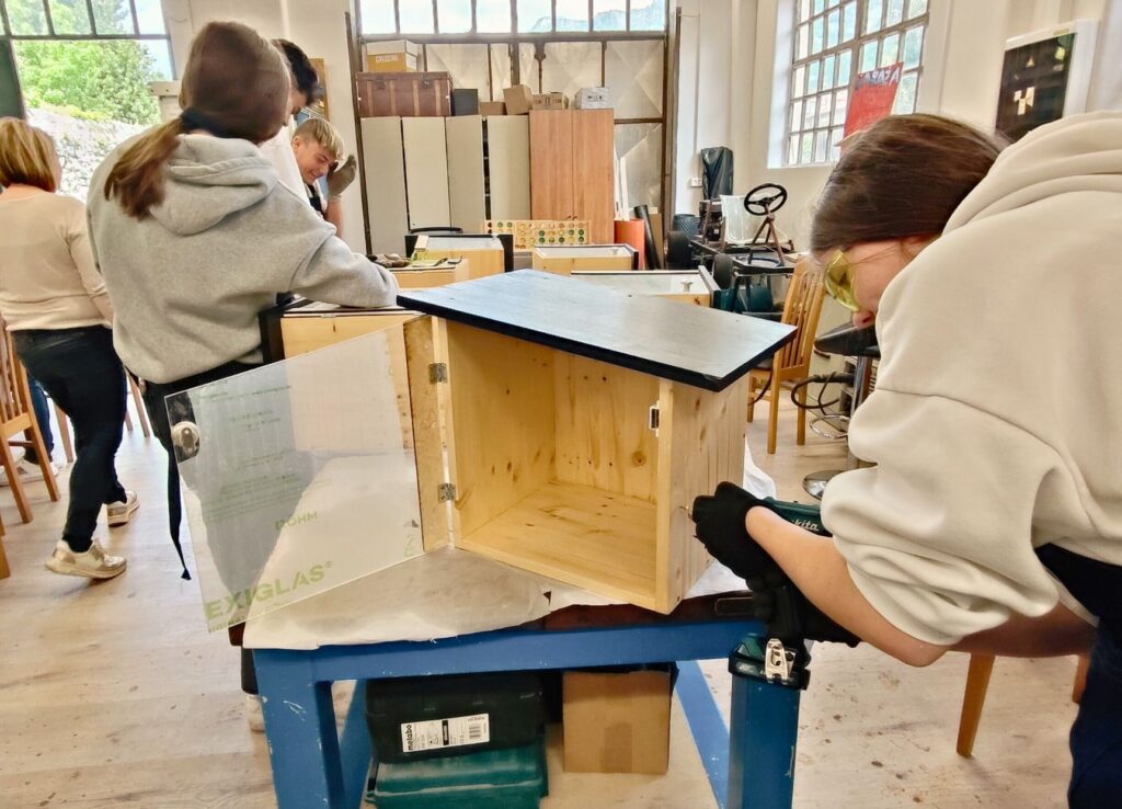 Poseben poudarek delavnice je bil na trajnosti in ponovni uporabi materialov, saj smo za izdelavo knjigobežnic uporabili odpadni in reciklirani les ter druge materiale, ki bi sicer končali kot odpadek. Mladi so se tako učili odgovornega ravnanja z viri, hkrati pa razvijali ustvarjalne rešitve za ponovno uporabo. V okviru delavnice so udeleženci pridobivali tehnične in ročne spretnosti (žaganje, brušenje, sestavljanje, vijačenje, barvanje), obenem pa razvijali oblikovalske in estetske ideje, saj so knjigobežnice poslikali in prilagodili prostoru, kjer bodo postavljene.