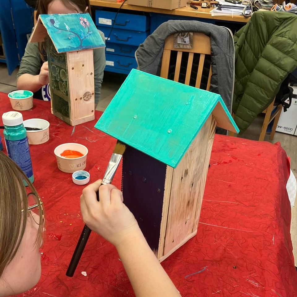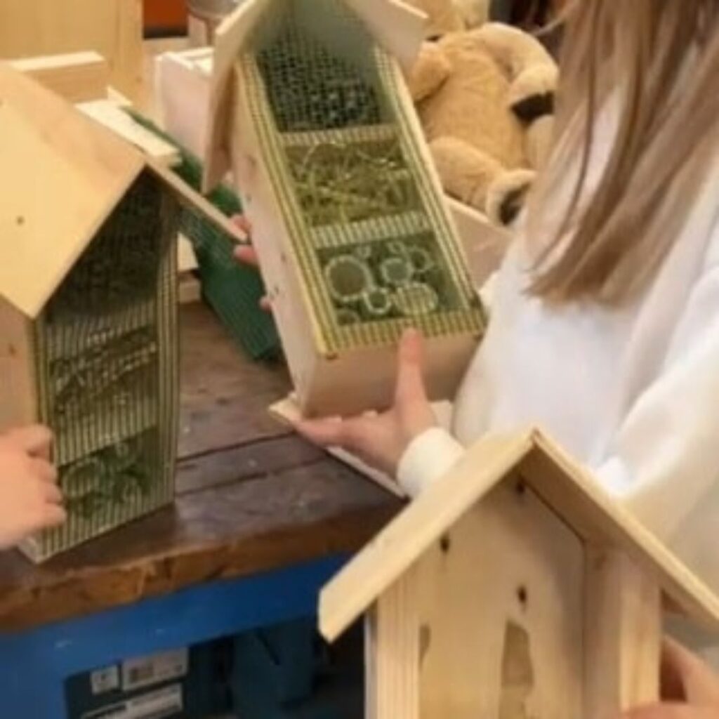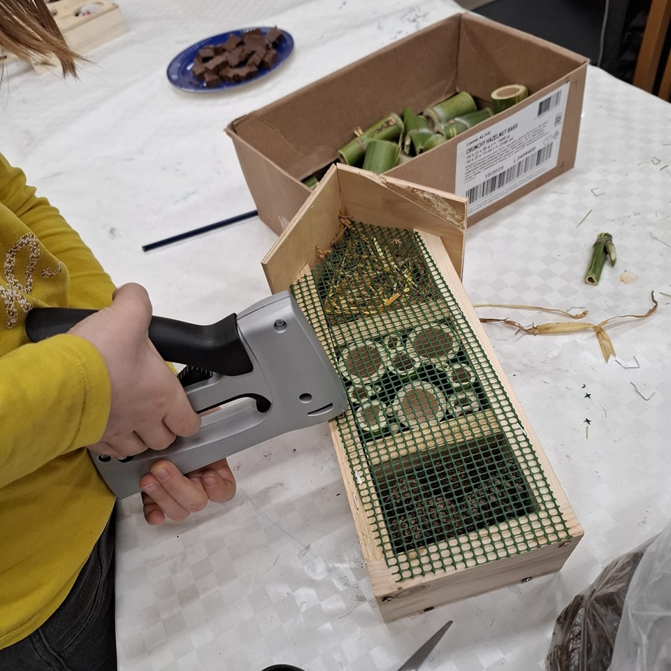Učenci so v prvem delu delavnice spoznali osnove dela z lesom. Sami so sestavili lesene konstrukcije, jih vrtali, zabijali žeblje in tako iz surovih materialov ustvarili okvirje za bodoče hotele. V drugem delu so te domove za žuželke pobarvali v živahne, pisane barve, jih napolnili z naravnimi materiali, kot so slama, storži in bambus, ter zaključili z zaščitno mrežo, ki bo nudila varnost novim prebivalcem.